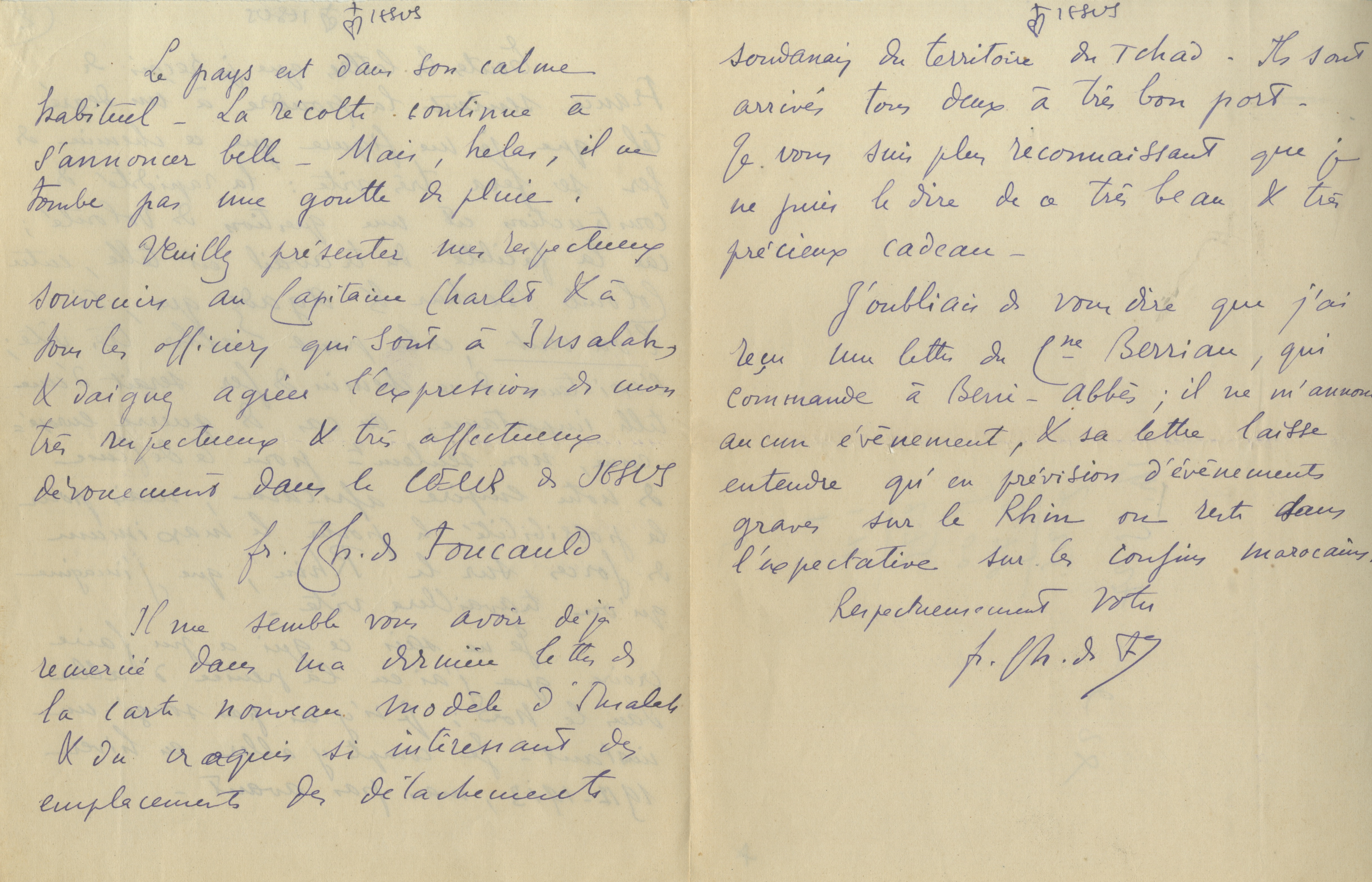 Il a reçu une lettre du capitaine Berriau, commandant à Beni-Abbès, laissant « entendre qu'en prévision d'événements graves sur le Rhin on reste dans l'expectative sur les confins marocains ».