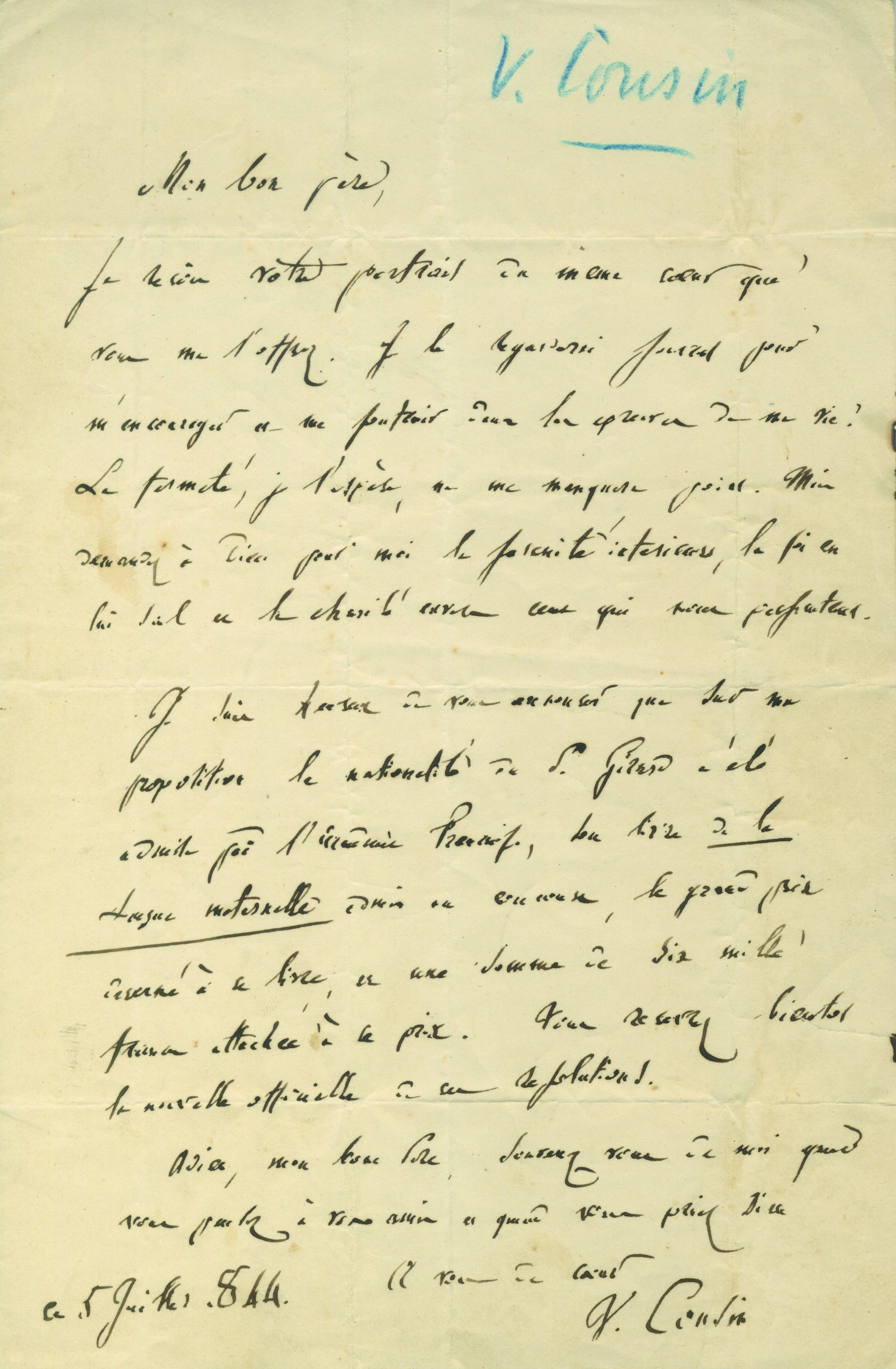 Puis il explique que, sur sa proposition, le livre du Père Girard, malgré la nationalité suisse de l’auteur, a été admis à concourir au prix Montyon auquel une somme de 6000 francs est attachée. « Vous recevrez bientôt la nouvelle officielle de ces résolutions. Adieu mon bon père, souvenez-vous de moi quand vous parlez à vos amis. Et que vous priez Dieu ».