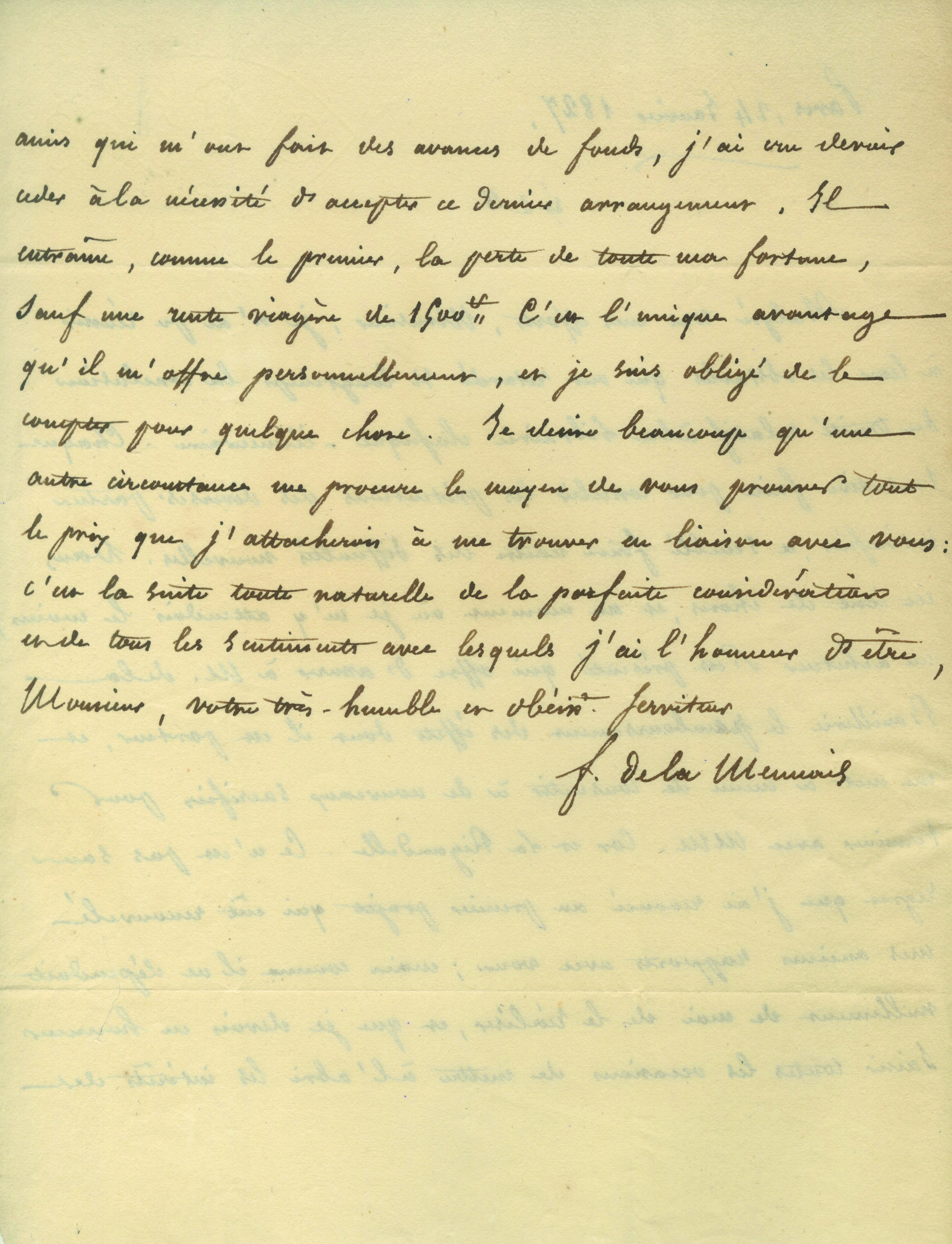 faitre naître des difficultés nouvelles. Dans cet état de choses et au moment où je m’y attendais le moins un acheteur s’est présenté qui offre et assure à M. de la Bouillerie le remboursement des éffets dont il est porteur et me met à même de consentir à de nouveaux sacrifices pour terminer avec MM. Cor et la Rigaudelle. Ce n’est pas sans regret que j’ai renoncé au premier projet qui eût renouvelé mes anciens rapports avec vous, mais il ne dépendait nullement de moi de le réaliser, et que je devais en homme saisir toutes les occasions de mettre à l’abri les intérets des amis qui m’ont fait des avances de fonds, j’ai cru devoir ceder à la nécessité d’accepter ce dernier arrangement. Il entraine, comme le premier, la perte de toute ma fortune, sauf une rente viagère de 1500f c’est l’unique avantage qu’il m’offre personnellement, et je suis obligé de la compter pour quelque chose. »