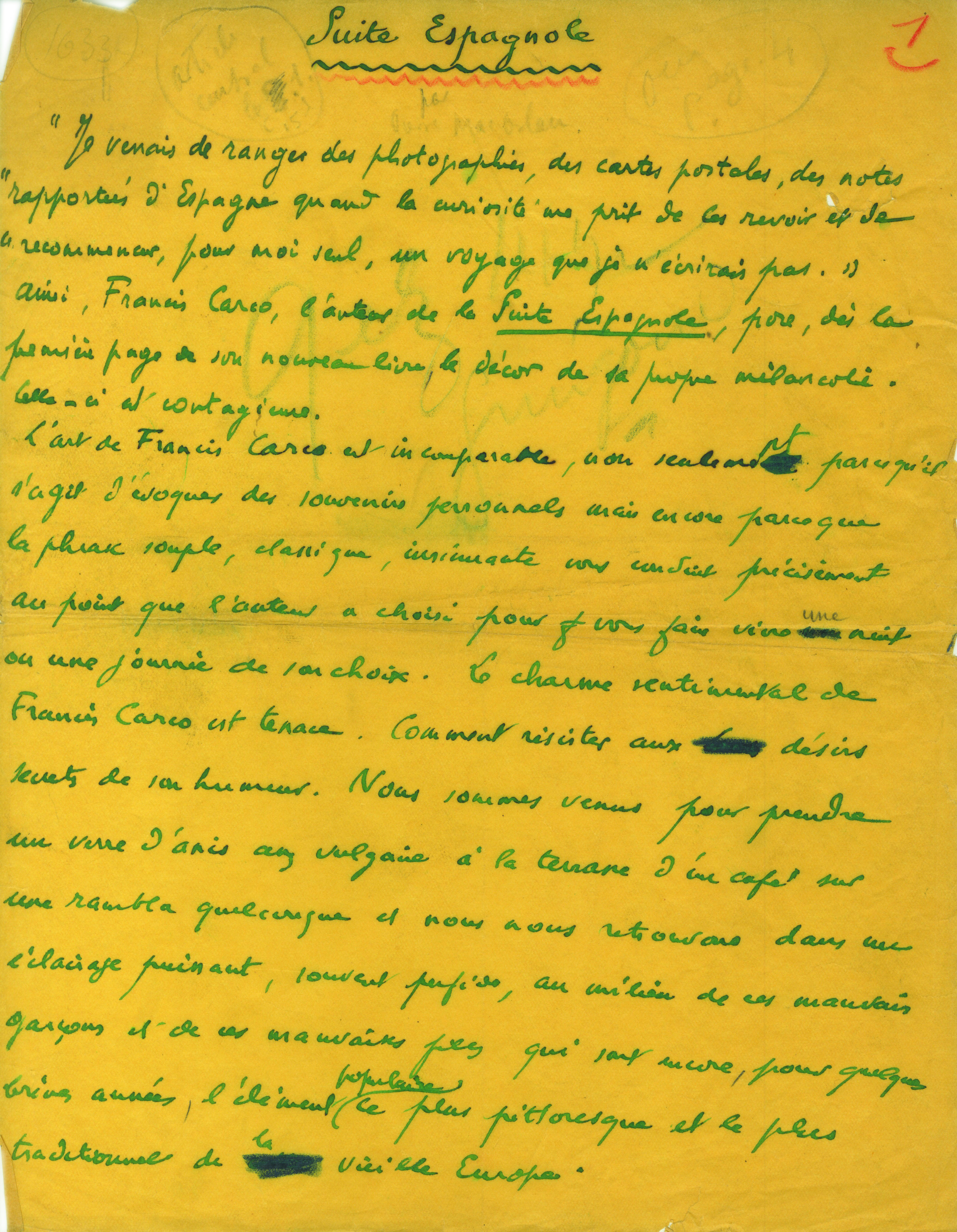 Manuscrit autographe signé. Intitulé « Suite espagnole », [1931] ; 5 pages ½ in-4°, sur papier pelure jaune.