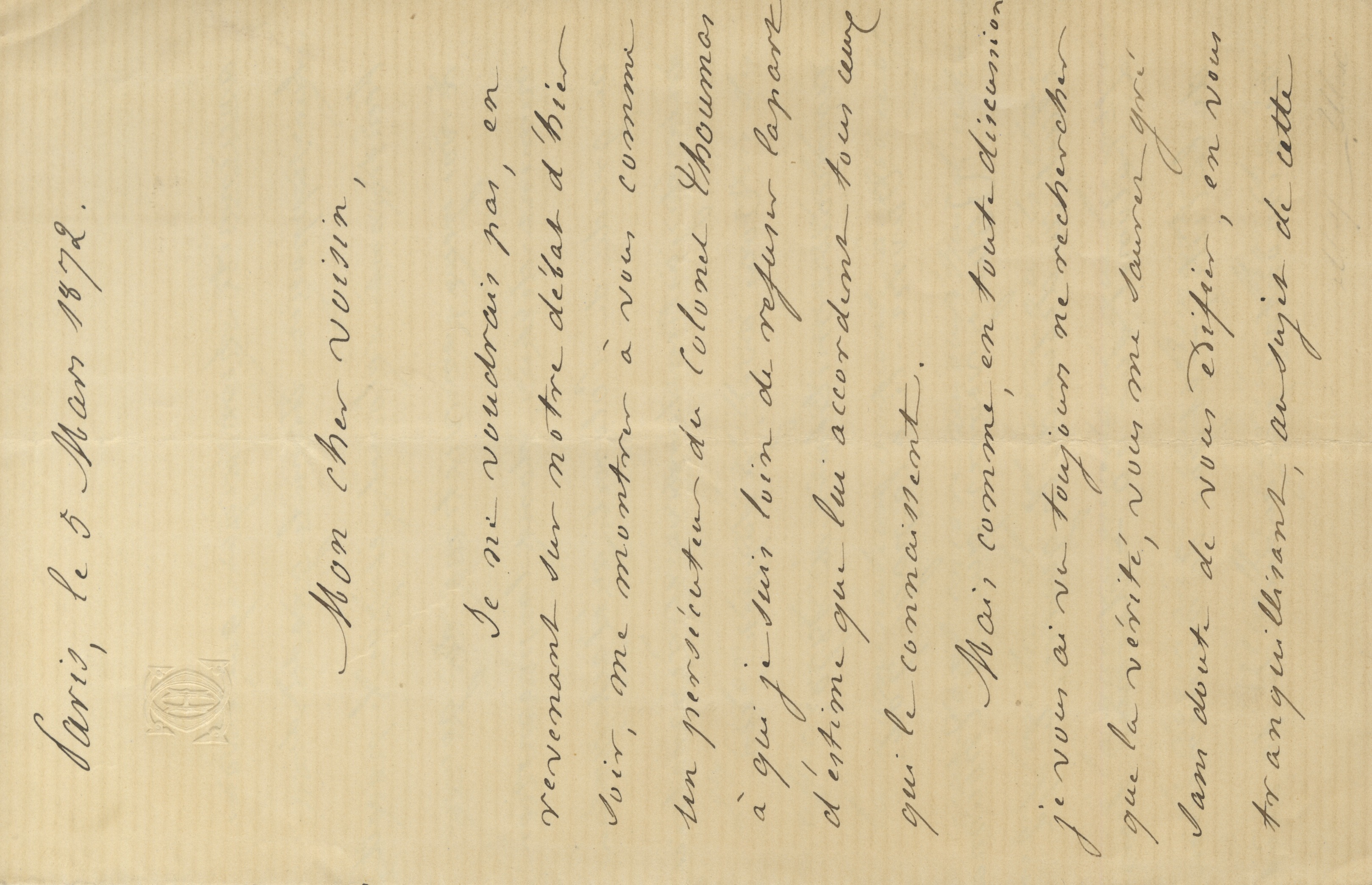 Lettre autographe signée adressée à son voisin. Paris, 5 mars 1872 ; 3 pages 1/4 in-8°.