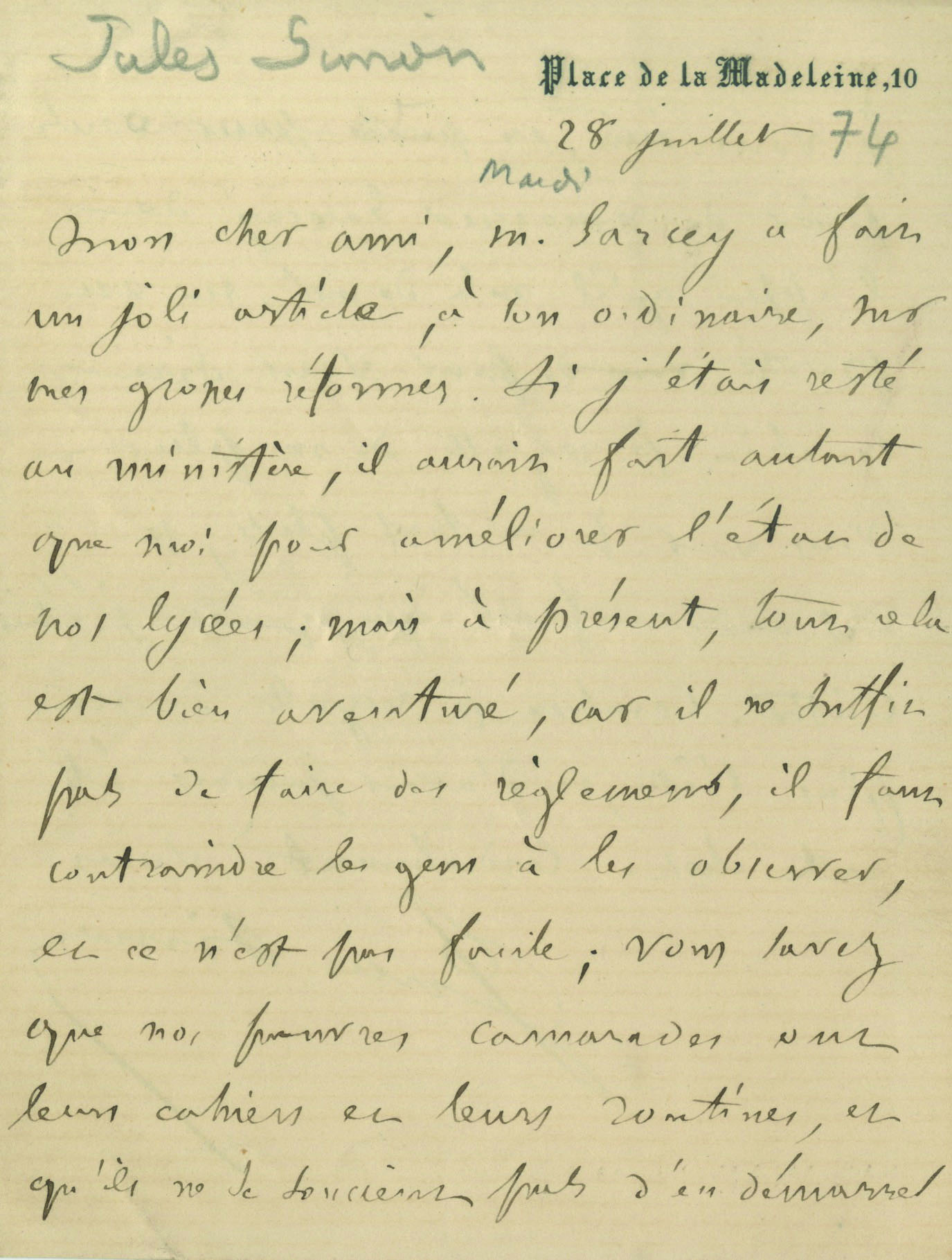 « M. Sarcey a fait un joli article, à son ordinaire, sur mes grosses réformes. Si j’étais resté au ministère, il arait fait autant que moi pour améliorer l’état de nos Lycées ; mais à présent, tous cela est bien aventuré, car il ne suffit pas de faire des règlements, il faut contraindre les gens à les observer, et ce n’est pas facile ; vous savez que nos pauvres camarades ont leur cahiers et leurs routines, et qu’ils ne se soucient pas d’en démarrer » Il demande ensuite à son ami de remercier Sarcey pour son soutient.