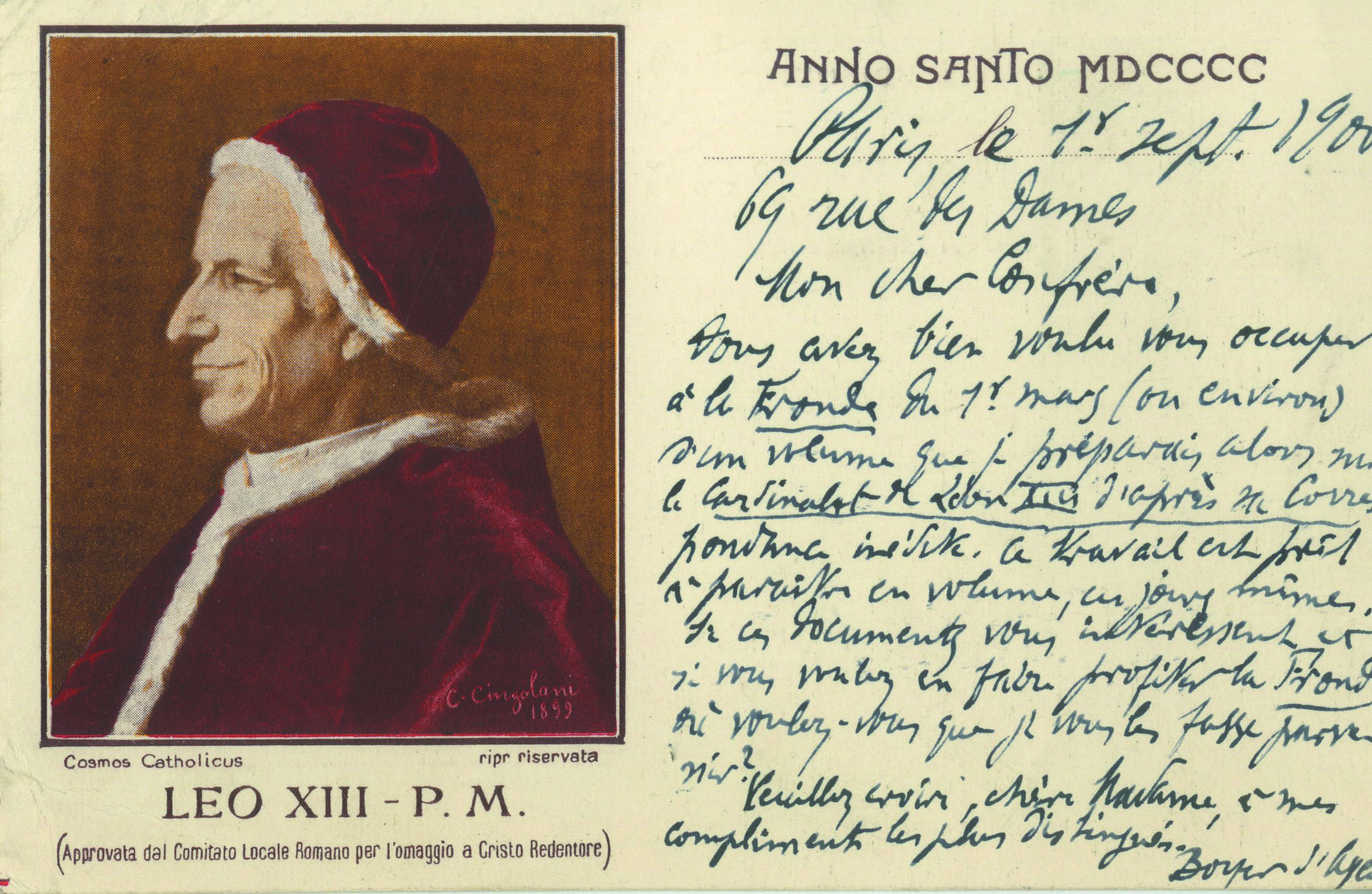 — La carte : « Vous avez bien voulu vous occuper à la Fronde du 1 er mars (ou environ) d’un volume que je préparais alors sur le Cardinalat de Léon XIII d’après la correspondance inédite. Ce travail est prêt à paraître en volume, ces jours mêmes. »