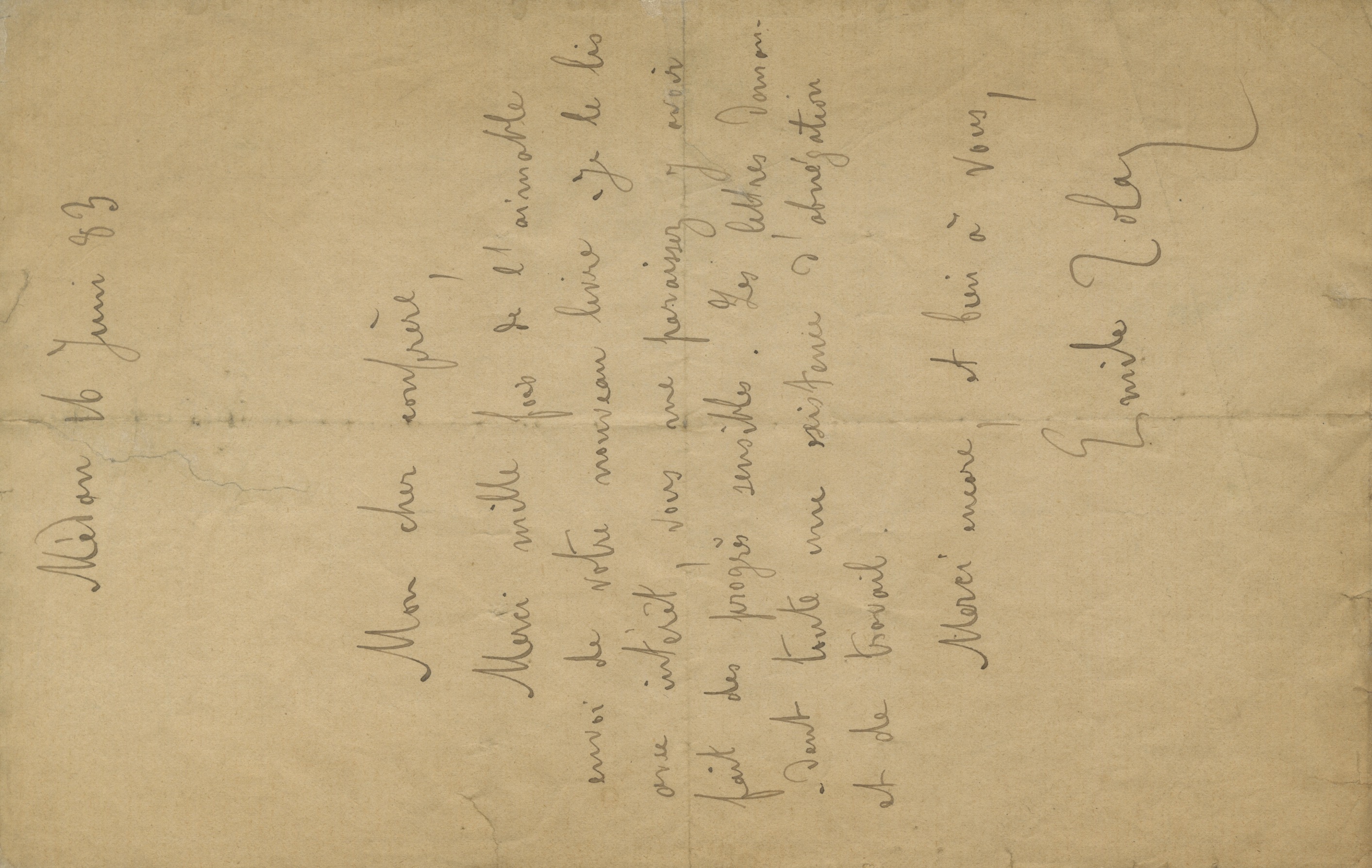 Lettre autographe signée adressée à un confrère. Médan, 16 juin 1883 ; 1 page in-8°, traces de pliures. Lettre de remerciements pour un livre qu’il vient de recevoir.