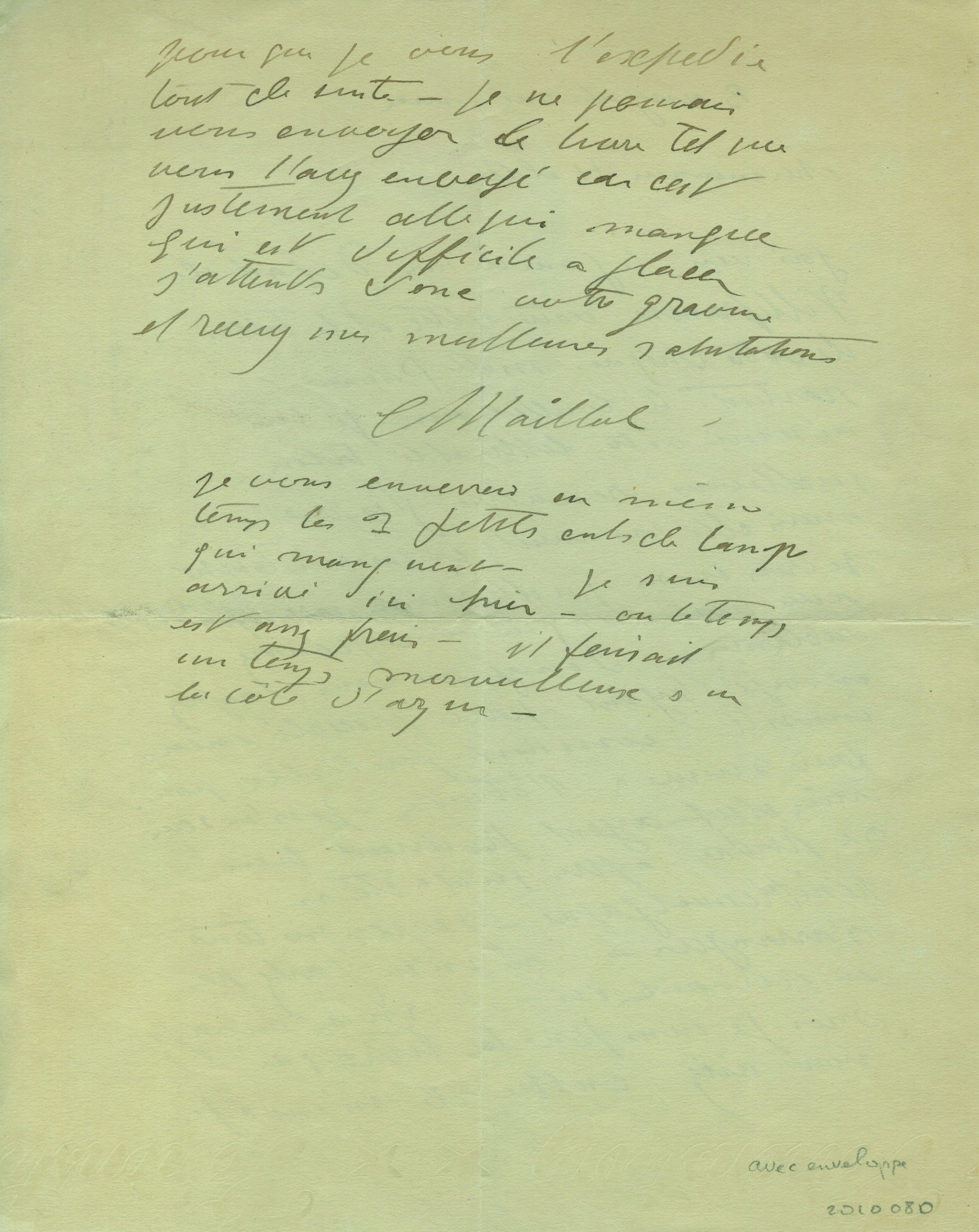 « J’ai reçu le jour de mon départ de Villefranche votre lettre et le talon de votre chèque. Mlle Pamanant partait le lendemain. Je lui ai remis votre lettre et le talon qu’elle vous renverra j’espère mais elle n’aurait encore rien touché. Je crois aussi qu’elle sera en correspondance avec vous et que vous pourrez réclamer […]. Mais envoyez-moi je vous prie la litho que vous avez oublié de m’envoyer pour que je vous l’expédie tout de suite. Je ne pouvais vous envoyer le bon [à tirer] tel que vous l’avez envoyé car c’est justement celle qui manque qui est difficile à placer. J’attends donc votre gravure. »