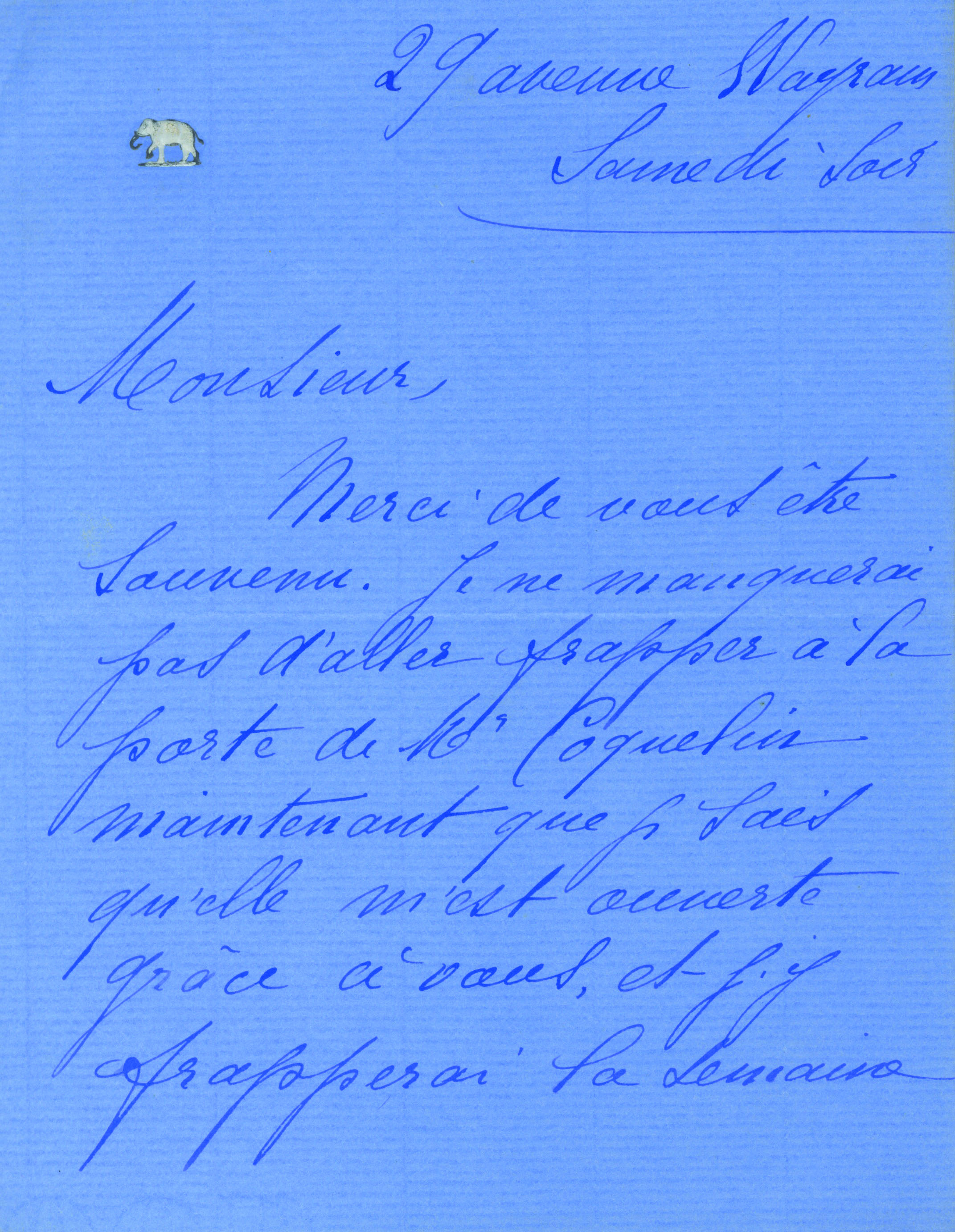 Lettre autographe signée, adressée à M. Dettelbach. « Samedi soir » [décembre] ; 2 pages in-8°. En-tête manuscrit du 29 avenue Wagram.