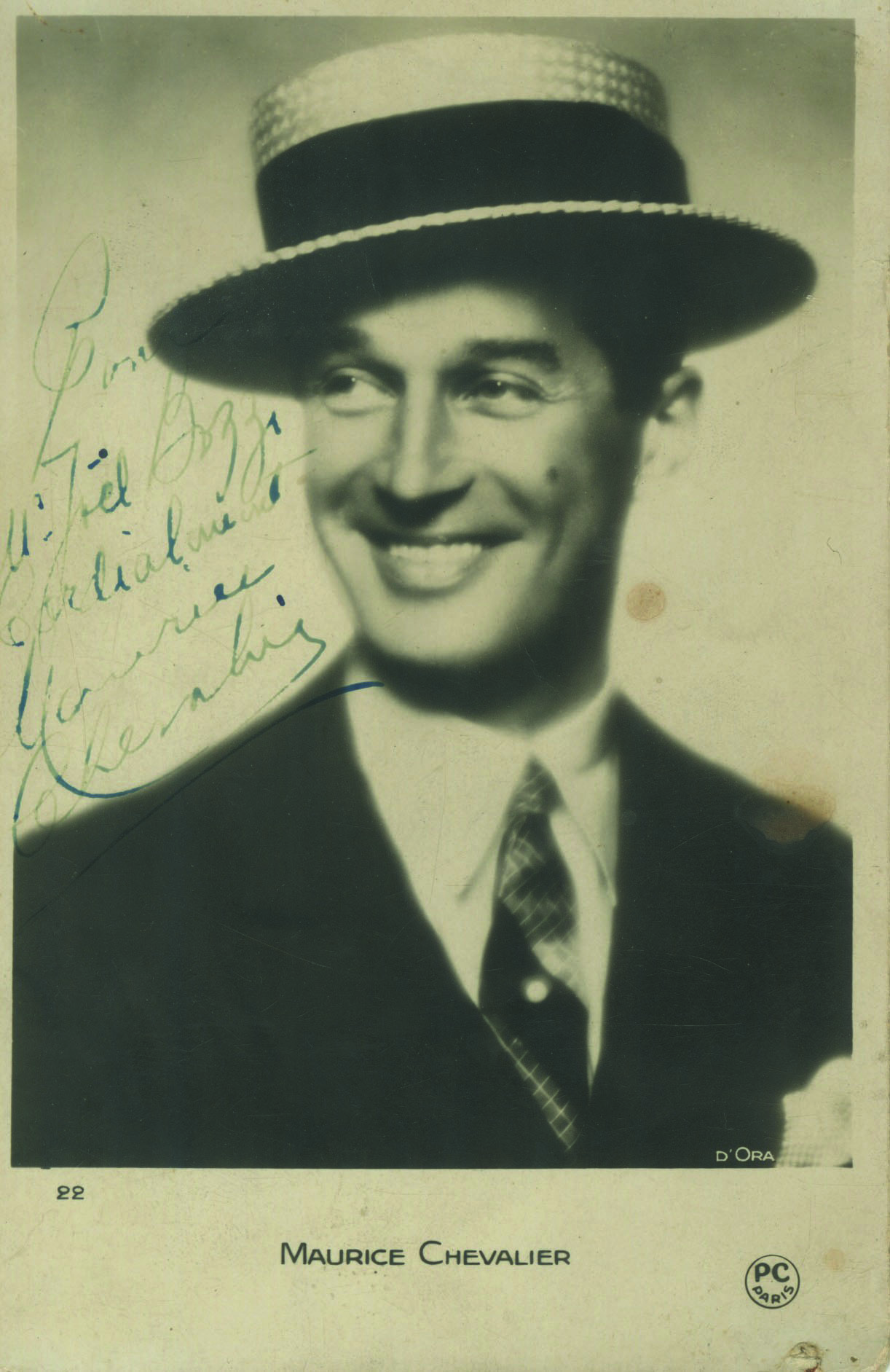 Photographie dédicacée et signée. Maurice Chevalier est souriant et porte son celèbre canotier.